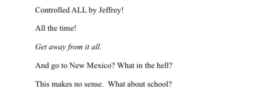 THE NAMES NAMED (might have missed some, please note so if I did)Paul S. Atkins? – Chairman of the U.S. Securities and Exchange Commission - “I am lost. Mr. Mody. Mr. Robert. Mr. Sant. Mr. Ludwig. Mr. Cecchi. Mr. Mora. Mr. Goodlatte. Mr. Atkins are not who they say!”Leon Black - MOMA Billionaire Art collection https://www.newsweek.com/leon-black-accused-raping-autistic-jeffrey-epstein-sex-slave-1815663 “Leon Black has been accused of violently raping a 16-year-old girl with autism and Down syndrome while asking "what made her 'Jeffrey [Epstein's] special girl,'" according to a New York lawsuit.” “My mother has lost her fucking mind. Even though Ghislane said it was best to take me home because Mr. Black is so important for some reason over my health. There is going to be hell to pay. I ruined their trip and I am dramatic when that fat fuck bit me! He threw me on the floor and blood all over Jeffreys carpet and I am the issue? Who the fuck bites someone? Sick! No one is that important and Leon can go fuck himself.” • [page with a poem entitled "Stopped Dead"] Leon Black. Underlined words in the poem: birth, cry, fatso millionaire, it's violent, goddamn baby screaming, there's always a bloody baby, your seven chins, still as a ham.* Mr. Caruthers – R. Michael Carruthers, Chief Financial Officer of Edgewise Therapeutics, Inc? – “Disgusting pigs like Allen Douschewitz and Mr. Caruthers and even Mr. Islam will hurt you especially if Ghislaine is busy or not with you!”Steve Case - businessman and former chairperson of AOL – “Whether its with Jeffrey, Mr. Leonsis, Mr. Case, Mr. Snyder, the Gregorys, Mr. Colgan or one being borrowed by a seemingly "good" federal worker and even rented,”Giuseppe Cecchi? - real-estate investor/developer - “I am lost. Mr. Mody. Mr. Robert. Mr. Sant. Mr. Ludwig. Mr. Cecchi. Mr. Mora. Mr. Goodlatte. Mr. Atkins are not who they say!”