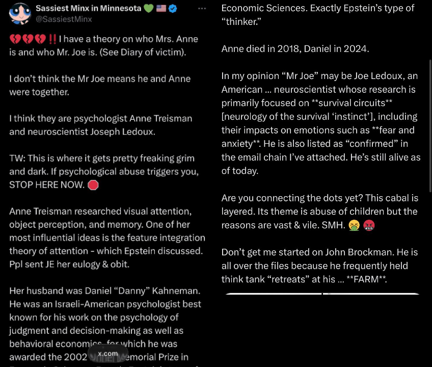 >>527659658Mr. Islam Joseph Jacobson? - Associate Professor of Media Arts and Sciences, Media Lab - “but so does Jeffrey and Mr. Jacobson. Mr. Conway”Jim Kimsey – CEO and Co-Founder of Global Accountability Corp, - “Mr. Kimsey is deranged”Ted Leonsis - former senior executive with AOL – “Why would they all allow Mr. Leonsis wait this long?”Marvin Minsky - AI Pioneer, Cognitive Scientist & MIT – “Mr. Sauerkraut krauss and martin minsky are gross but I felt sort of sorry for Mr. Novak”George Mitchell - The former US senator who played a critical role in Northern Ireland's peace process once described his friendship with convicted sex offender Jeffrey Epstein as a "blessing", according to a handwritten letter in what has been described as Epstein's "birthday book". “They are always flights of horror. Whether it’s with Jeffrey, Mr. Leonsis, Mr. Case, Mr. Snyder, the Gregorys, Mr. Colgan or one being borrowed by a seemingly "good" federal worker and even rented, it is all horror. And nothing is as it seems. I am so confused by everything and people you expect to be good like even old senators like George Mitchell who you think would be good like a grandpa are bad.” Narendra Modi? (Mody sic) - Prime Minister of India “I am lost. Mr. Mody. Mr. Robert. Mr. Sant. Mr. Ludwig. Mr. Cecchi. Mr. Mora. Mr. Goodlatte. Mr. Atkins are not who they say!” Mr. Mora Martin Novak - Austrian-born professor of mathematics and biology at Harvard University - “Mr. Sauerkraut krauss and martin minsky are gross but I felt sort of sorry for Mr. Novak.”Mitchell P. Rales [Rails (sic)] – businessman and art curator. He co-founded Danaher Corporation -“Mr. Rails and Mr. Ein [clipping: blood on their hands]” Joseph & Jill Robert - listed in Epstein's black book on page 46. “Went to a party at this huge house to meet this man named Mr. Robert and his pretty wife Jill.” Mr. Sant