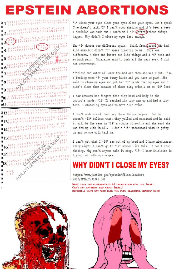 >>527681367>>527680107>>527679873>>527677291I stand corrected. Can't accuse them of using a bad AI translation because it would muddy the waters. Here is the new meme. Also changed to Epstein's Sex Slaves so as not to imply that all babies were aborted, because they weren't. Some were taken alive. Sacrificed, because referred to in past tense? Used as future breeding stock at Zorro Ranch? Poor girl/girls