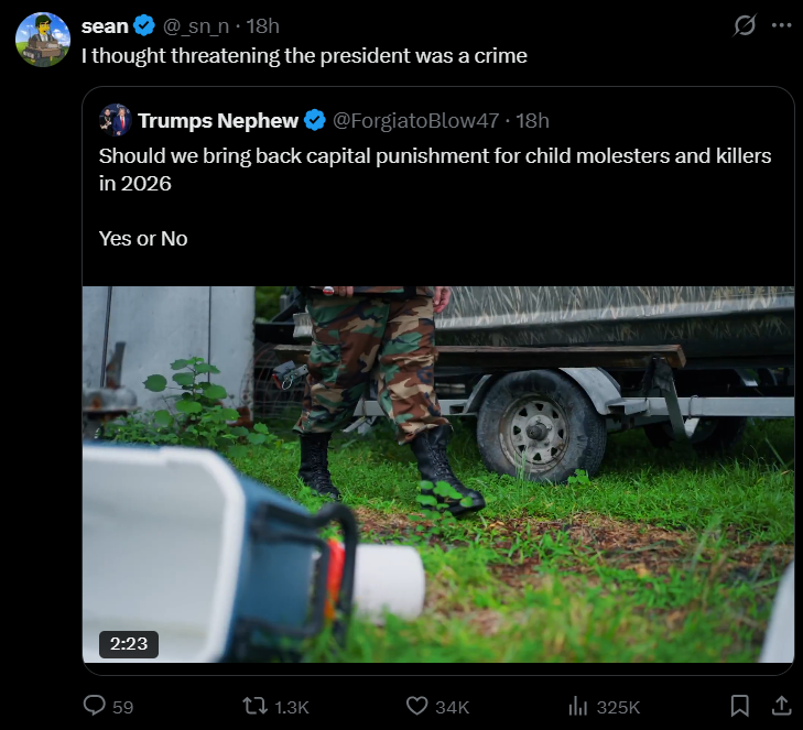 You cannot threaten the president. 8647 was a valid threat by Comey as per his arrest. This set the precident for all other threats.This post is informative and in no way shape or form a threat .