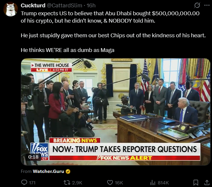 >>527673693It's all part of the AI scheme to keep the circular funding going. The Ponzi is so large the gov has to get in on it and find more funders before Open AI collapses after getting squeezed out by Nvidia/oracle. The Emirates will line Trump pockets & will get the best chips and then they'll invest in AI in exchange. It will end badly.