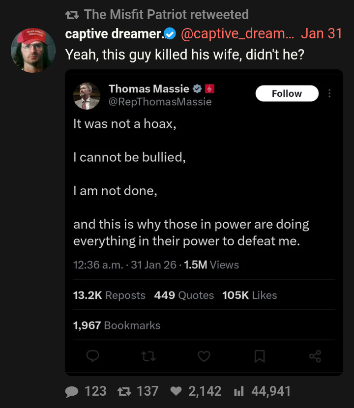 i know this is posted ironically, but it brings joy to me seeing MIGA call someone a democrat solely because they pushed for the release of files related to the most notorious pedophile sex trafficker is hilarious and also tells any logical person everything they need to know about miggers.