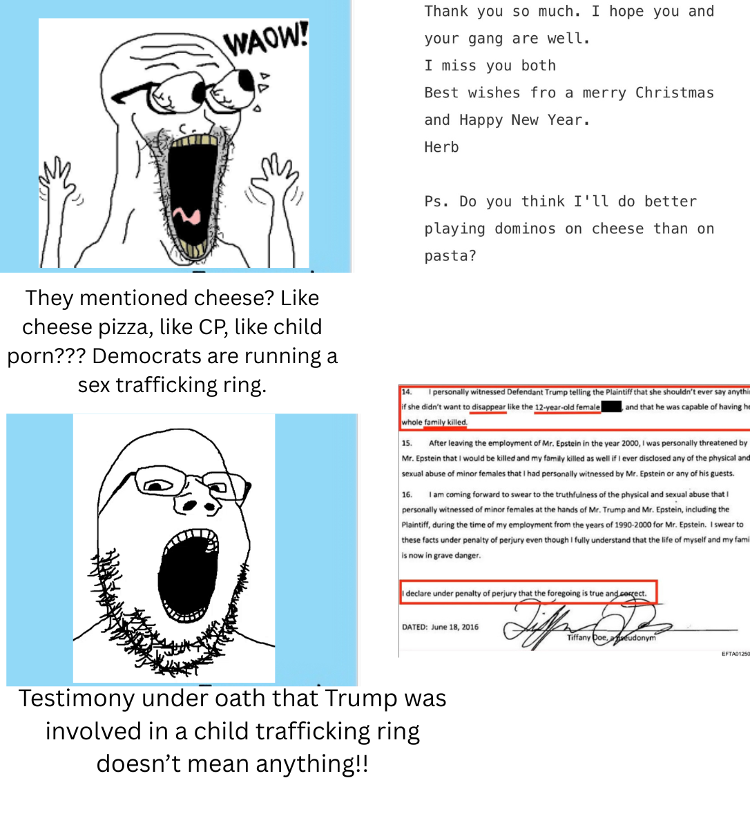 >>527677712it's not just "articles that mention trump" there's sworn testimony from the victims in there. Why do you people always give Epstein's neighbor and best friend the benefit of the doubt and in the same breath say the evidence only implicates the specific people that you hate? Almost every political elite is implicated in these files regardless of party affiliation.You're actually the guy in this meme >>527674591