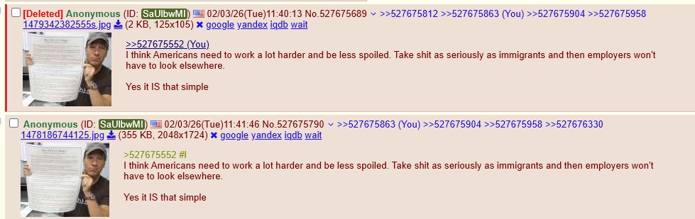>>527675373>People who are vetted hard workers who don't complain, aren't demanding and don't push communism/collective bargaining are vital to the arteries of industry, and for that you often need foreign laborSo American workers wanting better conditions should be replaced by foreign workers? You think that's what's best for americans?