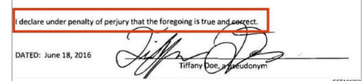 >>527679306>June 2016, at the height of false allegations that never went anywhere flying through the air>Sworn Affidavit>Literally signed "TIFFANY DOE"