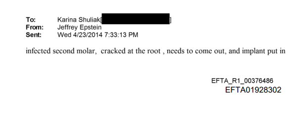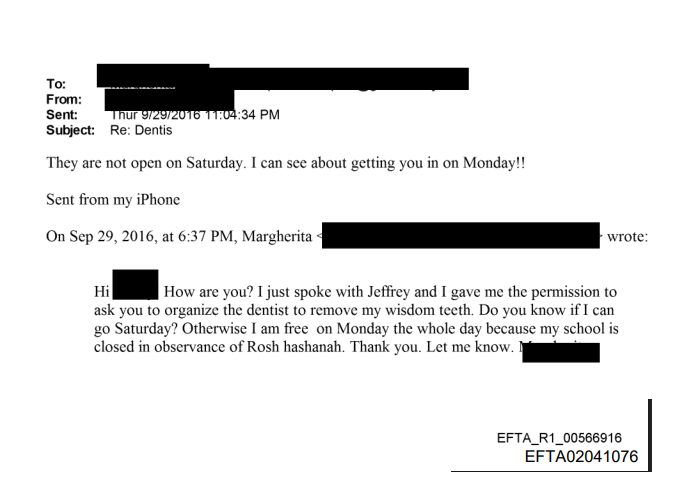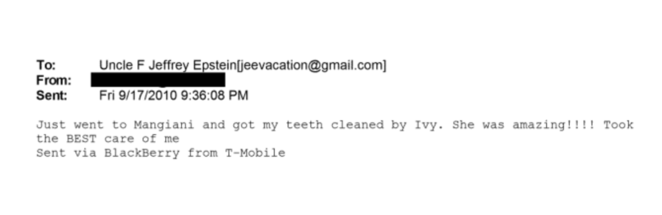as for the "ivy"/"tooth" issue. there is something very weird going on with epstein's obsession with teeth: (1) getting his teeth allegedly cleaned constantly and (2) collecting widsom teeth from victims. it is at least very consistent that ivy could be his daughter because she seems to be dr. magnani's dental assistant, and if there is something "super shady and weird" like i dunno just spitballing collecting living teeth for some kind of stem cell/clone shit (?) (my theory), then it makes sense that he needs someone super inner circle to be the dental assistant here. just a thought
