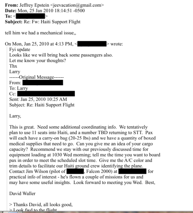 There are quite a few search hits on Haiti. Many of them have to do with flights in/out. Might be worth a look.https://www.justice.gov/epstein/files/DataSet%209/EFTA00765443.pdf
