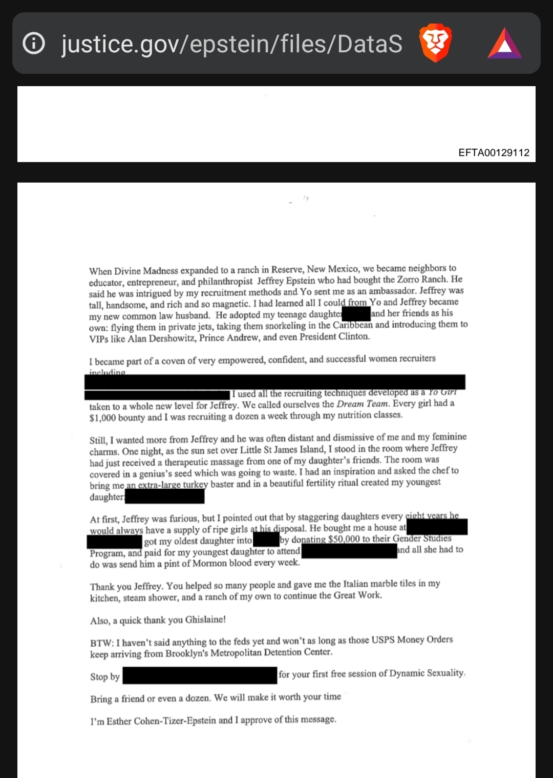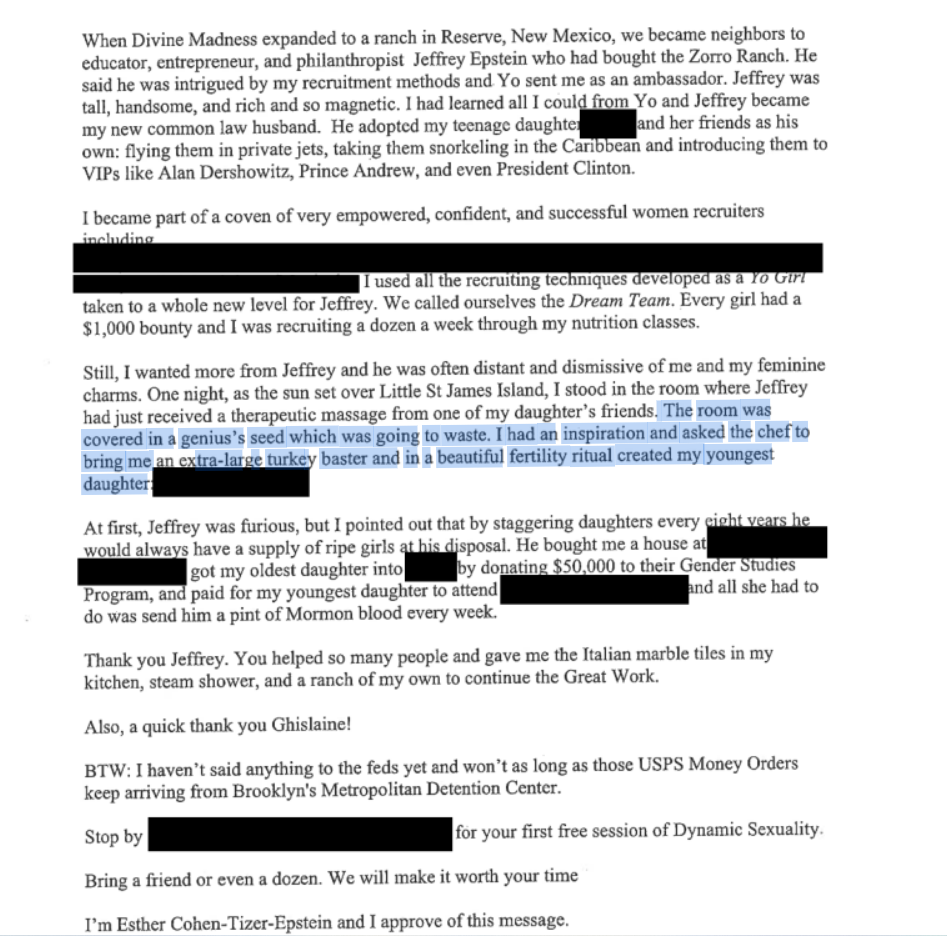 >>527690963>Cohen>Bali Indonesiahttps://www.justice.gov/epstein/files/DataSet%209/EFTA00129111.pdfthis letter was sent after Epstein was "dead" so who was sending it, and to whom, and if its as fake as it seems, why censor it?Divine Madness Ranch is right next to Zorro ranch and the cult does brainwashing sex shit according to wikihttps://en.wikipedia.org/wiki/Divine_Madness_Running_Club> former members of the club have further called him a "manipulative, alcoholic, sex-addicted despot". Tizer's training methods include sleep deprivation, food withholding, and forcing club members to consume alcohol and have sex with him and with one another>In 1989 Yo Tizer began a practice of "envelope marriage", where one male and one female member would each have their name drawn from a hat and then they were "married" for a week in order to break them from their "attachment" to choosing partners. He advised them that he could control fertility by muscle testing and herbs. When the women often became pregnant he would order them to have abortions to break their "attachments" to being mothers. Except for his own children, who he allowed to be born and raised in The Community, and for several women whom he deemed so pathologically self-centered that they needed to be broken of their "attachment" to themselves.