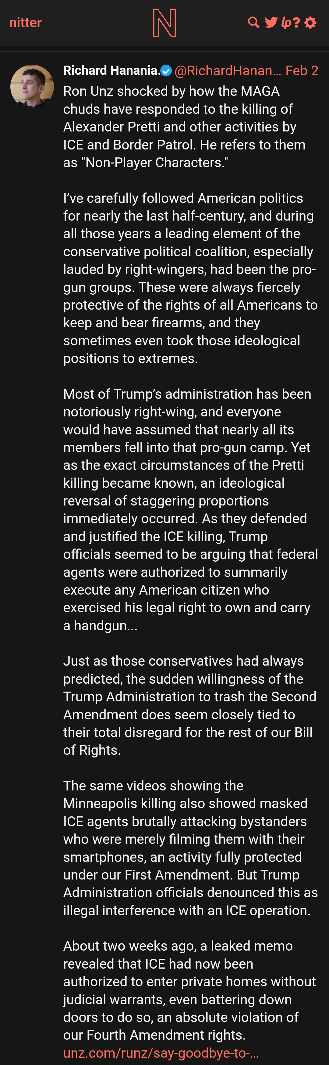 >>527699119>Nothing at all to do with the 2nd. I don't care that he had a gun, I'm not even angry he was armed when he chose to commit a crime. I'm angry he chose to commit That crime, and then do That to delay or avoid his consequences.>Congrats black people, you've seen yet another case in the last 30 days where a white person was treated like a criminal and died for resisting. Weird, how Greenwald ignores that entirely, and wants us to be some WLM group.Well said... Greenwald and the rest of these D&C faggots are trying their best to split MAGA by any means necessary including completely gaslighting a situation and and argument that doesn't exist. There's been a couple lefty gun groups (NRA included) that released some weak tea finger wagging statements but others like GOA were much more even handed. This is a completely stawmanned outrage by the usual suspects