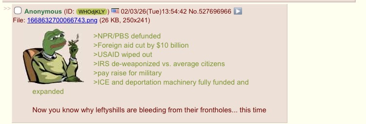 >NPR/PBS defunded>Foreign aid cut by $10 billion>USAID wiped out >IRS de-weaponized vs. average citizens>pay raise for military>ICE and deportation machinery fully funded and expandedNow you know why leftyshills are bleeding from their frontholes... this time