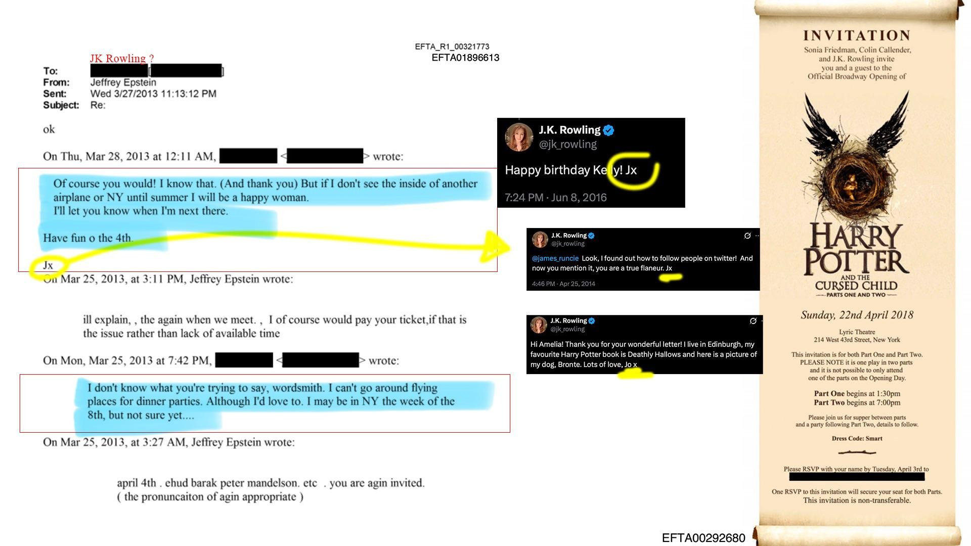 https://www.boredpanda.com/newly-released-epstein-doc-made-harry-potter-fans-furious-with-jk-rowling/JK Rowling in Epstein files:https://www.justice.gov/epstein/files/DataSet%2011/EFTA02240643.pdfhttps://www.justice.gov/epstein/files/DataSet%209/EFTA00828196.pdfhttps://www.justice.gov/epstein/files/DataSet%209/EFTA00957474.pdfhttps://www.justice.gov/epstein/files/DataSet%2011/EFTA02333181.pdfNote from "Jo x" (Rowling's signature) in Epstein's belongings at page 63: https://www.justice.gov/epstein/files/DataSet%203/EFTA00005386.pdf