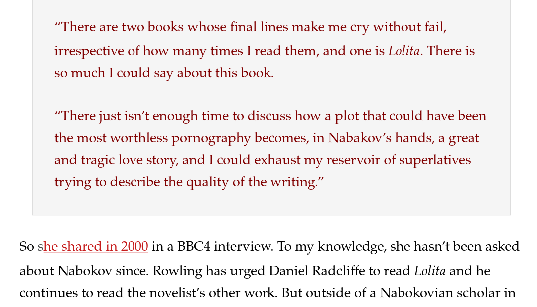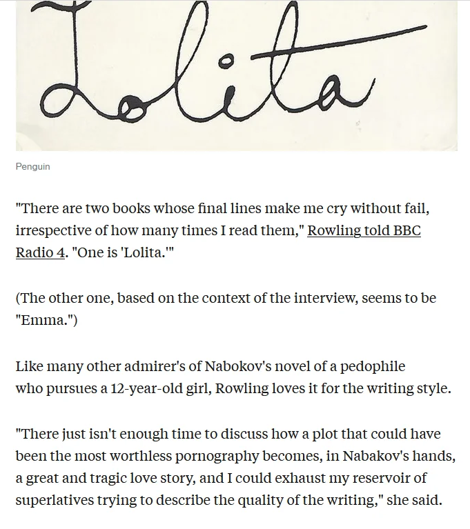 JKR ("J x"): says one of her favorite books is Lolita and calls it a "great and tragic love story":https://www.businessinsider.com/jk-rowling-favorite-books-2016-7#lolitaby-vladimir-nabokov-19It is a book written from the perspective of a child rapistThe book is referenced in Harry Potter character names:https://www.hogwartsprofessor.com/harry-potter-and-lolita-j-k-rowlings-relationship-with-vladimir-nabokov/
