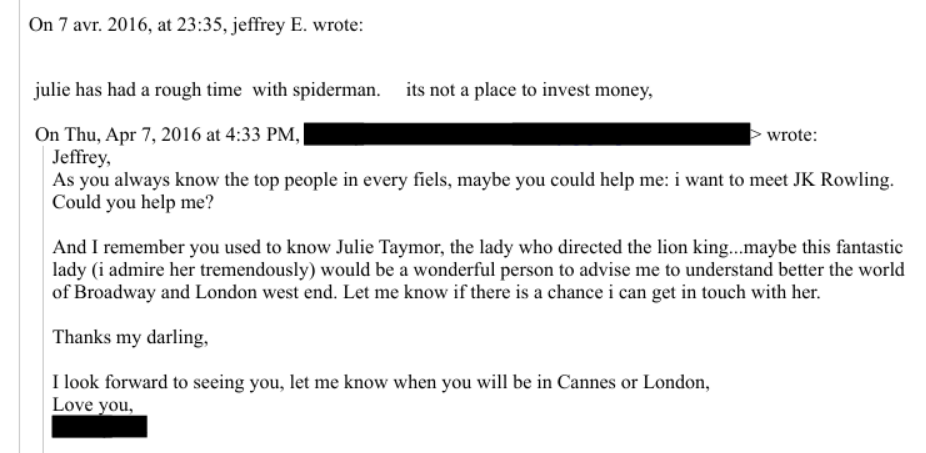 Email to Epstein asking to meet JK Rowling https://www.justice.gov/epstein/files/DataSet%209/EFTA00828196.pdf