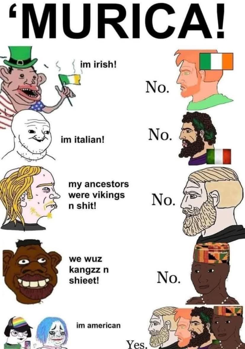 >>527736268>Do not pretend there's anything european about you...the average amerimutt will tell you a story about his great-great-great-great grandfather's neighbour's friend from work, who once sat next to a stranger on a train, who told him about a film he watched about a german couple on holiday in italy. therefore, he is "italian" too.it's all so tiresome. these larping faggots need to be exterminated.
