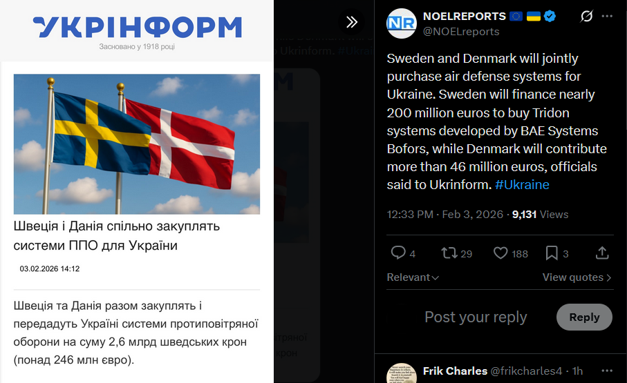 Sweden and Denmark will jointly purchase air defense systems for Ukraine. Sweden will finance nearly 200 million euros to buy Tridon systems developed by BAE Systems Bofors, while Denmark will contribute more than 46 million euros, officials said to Ukrinform. #Ukrainehttps://x.com/NOELreports/status/2018664210713157634?s=20>3th
