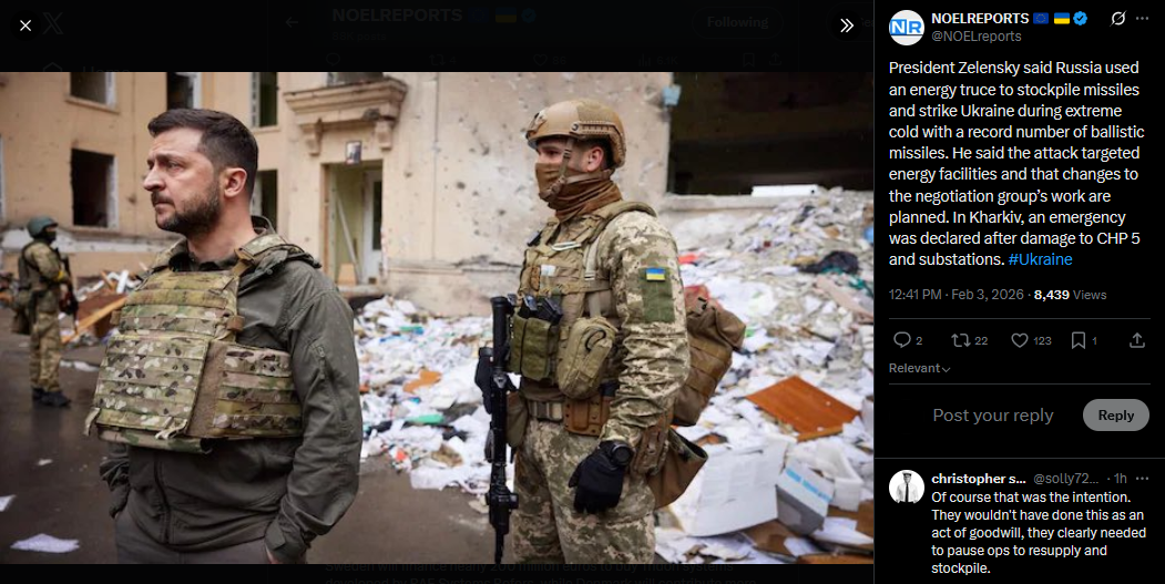 >>527761996President Zelensky said Russia used an energy truce to stockpile missiles and strike Ukraine during extreme cold with a record number of ballistic missiles. He said the attack targeted energy facilities and that changes to the negotiation group’s work are planned. In Kharkiv, an emergency was declared after damage to CHP 5 and substations. #Ukrainehttps://x.com/NOELreports/status/2018666147009192017?s=20>3th