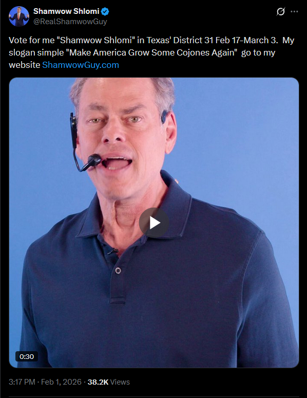 Shamwow Guy posted his first Primary commercial.https://x.com/RealShamwowGuy/status/2018071108147392632