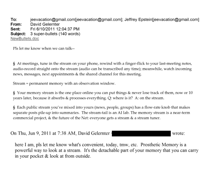 https://www.justice.gov/epstein/files/DataSet%2010/EFTA02037655.pdfWhat do you guys think they're talking about here? I quickly searched Prosthetic Memory, comes up with a fairly modern term regarding basically what I can describe as collective conciseness of history through modern media that anyone can access. Detachable memory. This was in 2011, is he talking about smart phones and streaming?