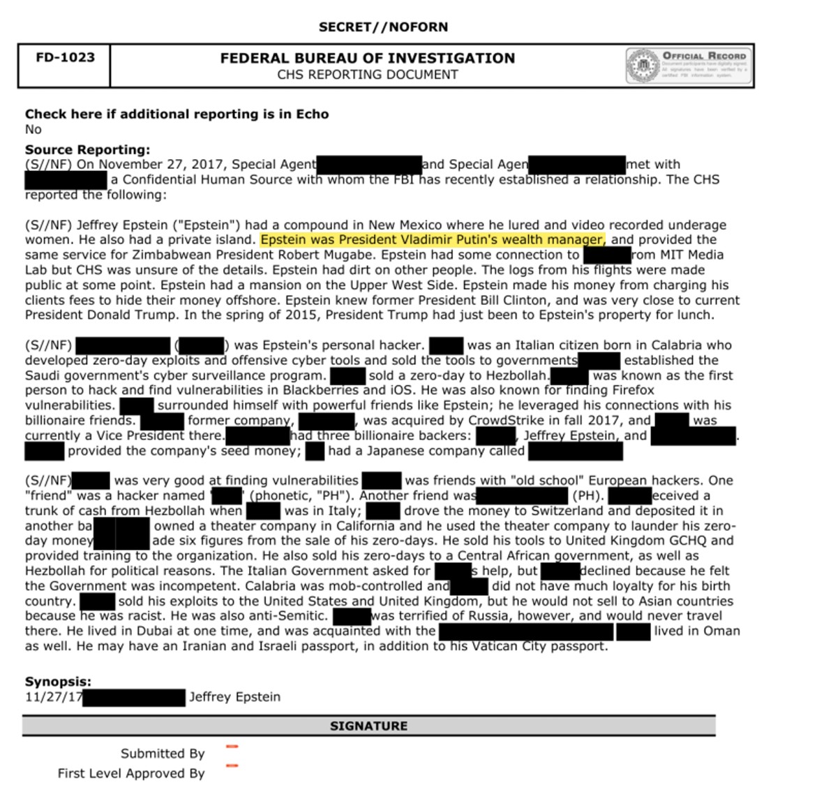 >>527790711>I don't know how the transnational crime syndicate works!We know you are retarded, you don't need to flaunt it. There are multiple emails of Epstein setting up meetings with Putin, especially trying to work Jagland of Norway to set up very high level, high stakes ones.>>527790682No it isn't, CHS are definitely a step above the RTOC line. Are you going to deny the CHS in pic related? Because its a highly placed source attesting to Trump being compromised by Israel. You niggers are literally too stupid to understand how spycraft and triple+ agency works nor how the crime syndicate actually operates, its entirely transnational and transactional.>>527790813That is simply a further linkage thats not fully collaborated based on what we have currently. He could have been, I never denied the Jewish dimension which regard to Putin revolves around Chabad and the jewish mob which wraps back around to Jared Kushner. The point is that the actual crime syndicate that this is all actually part of is functionally transnational and like always JQers are just mad reality is more complicated than wanting a monothetic jewish explanation for literally everything under the sun. Israel/mossad angle is central but Epstein was clearly just as plugged into the British and Russian element as the Israeli and American element.>>527790994Imbecile