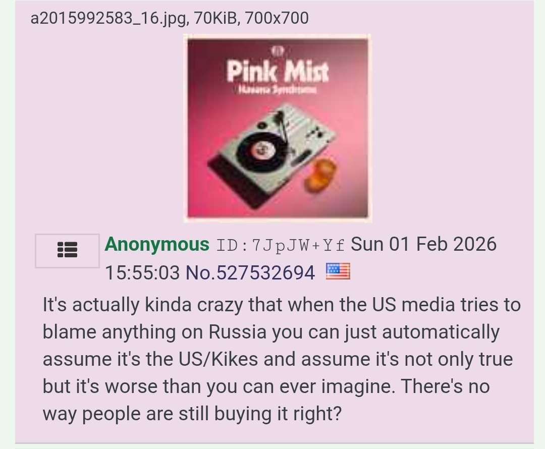 >>527791552>The guy was Bond villian tierBond is the villain in the James Bond story. Re-watch all of the Bond movies with the perspective that Bond is the bad guy, and look at what the "Villains" would actually have accomplished had there been no Bond to stop them. >>527792472>He was a pimp and a dealerHe is Mossad>His handlers tell him what to say and who to say it toYes, and just like the kike James Bond bullshit, Epstein faked his death. He's not dead. He's just Mossad. In the Epstein files you'll find his Mossad shirt.