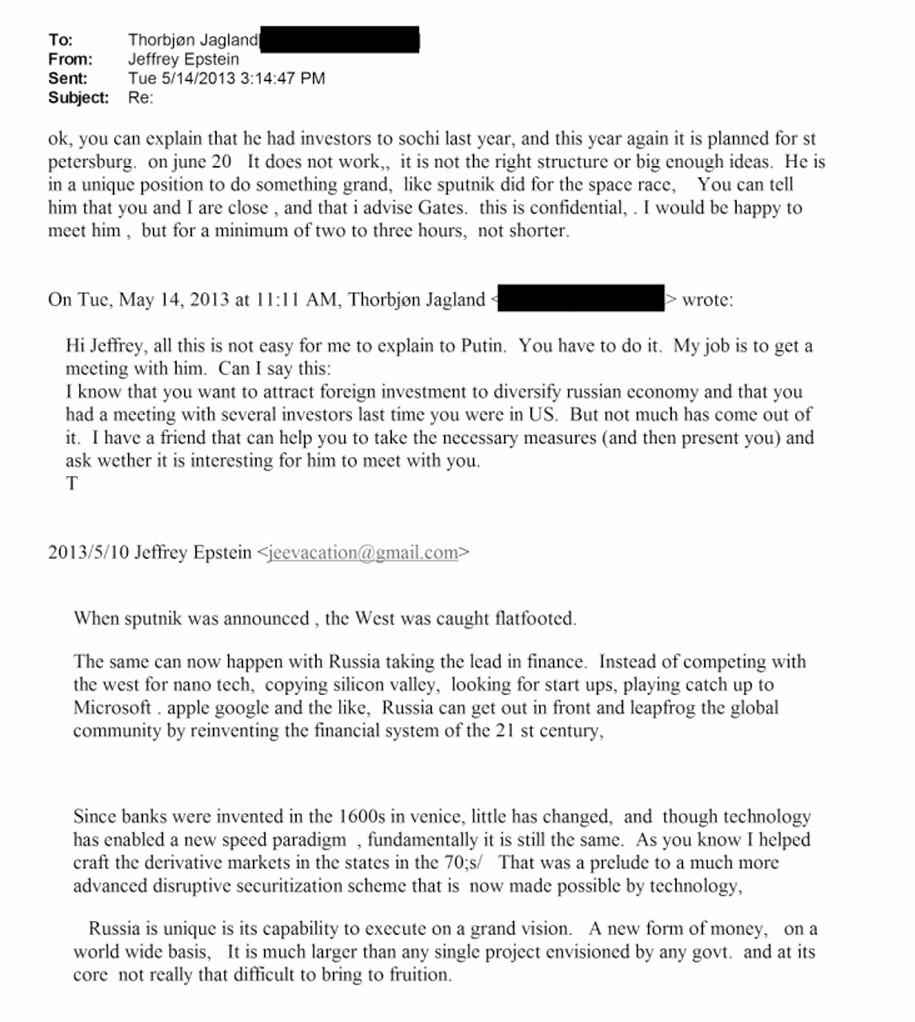 >>527791411Here's Epstein pitching to Jagland his idea's for Putin before a meeting to unseat the US financial system under a Russian financial revolution. This should have gotten Epstein shot in the back of the head for treason but it didnt. The guy was Bond villian tier with how many angles and sides he was hustling.