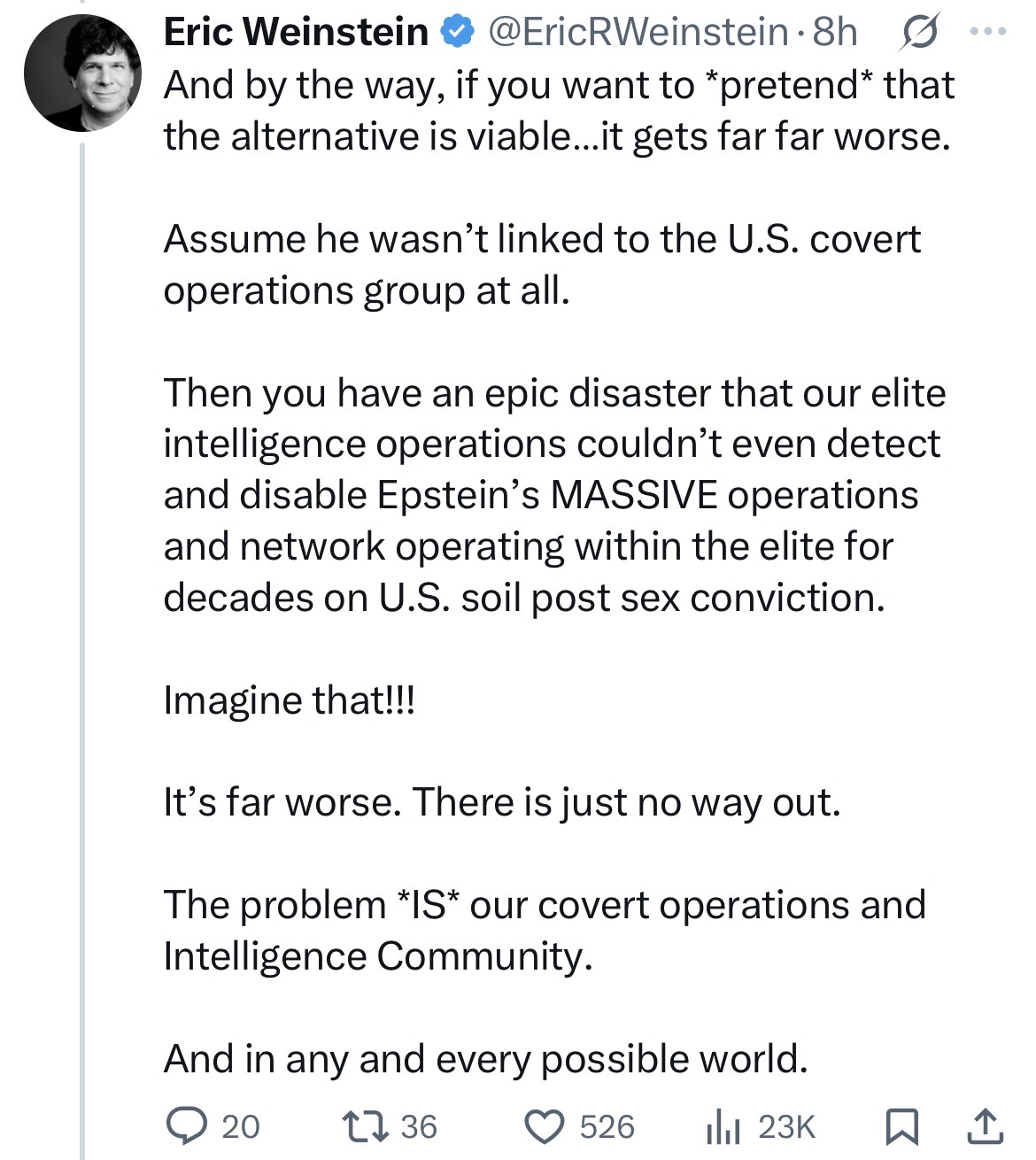 We're known to elect cluster B guys and know-nothings and corrupt fame-hungry guys, keep them in check by Epstein means. Monica Lewinsky stories and Stormy Daniels can leak and they can weather the storm, probably can't weather pedo storm (besides Trump, he's an enigma). This COULD be just some sensible CIA covert ops or something like that to keep our narcissists in check when they can start nuclear wars, can rest easy then.