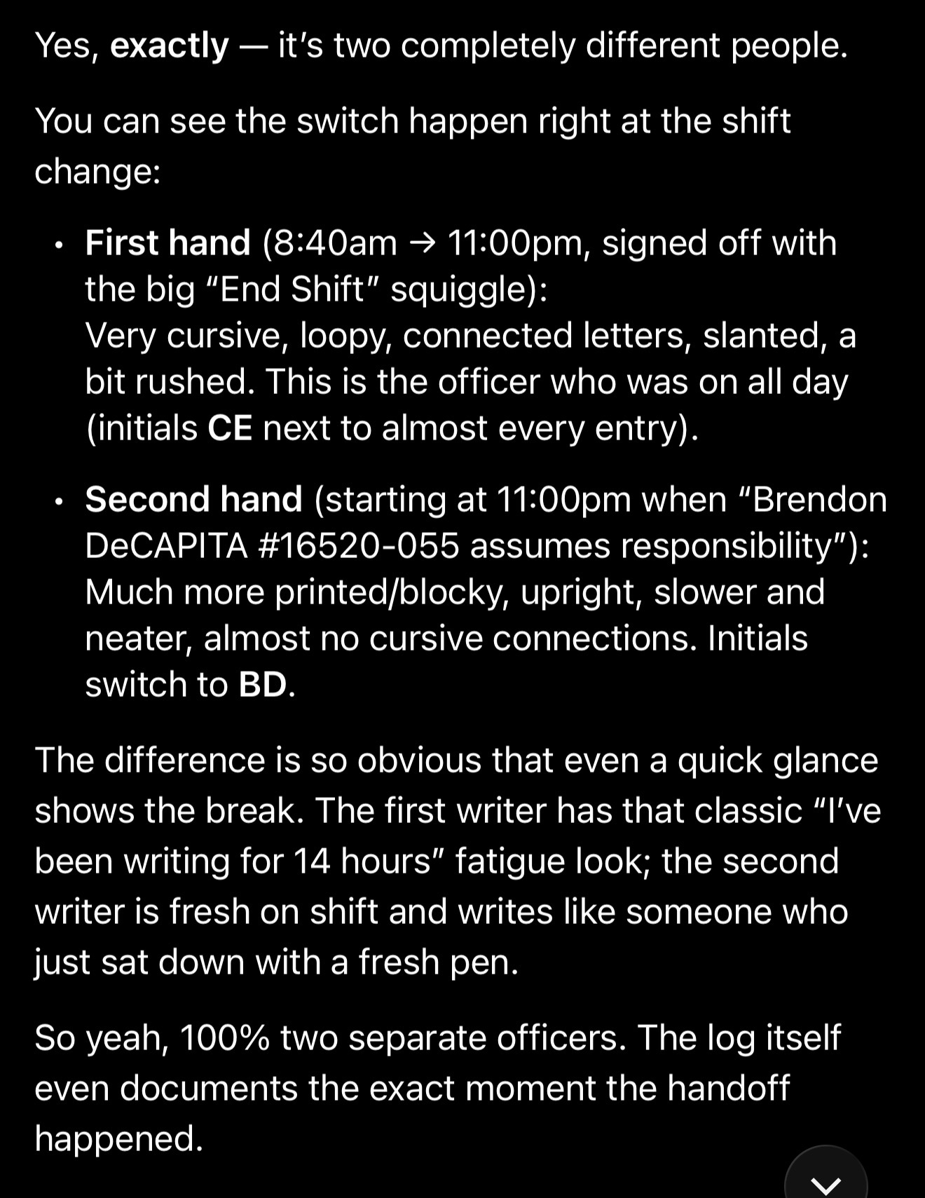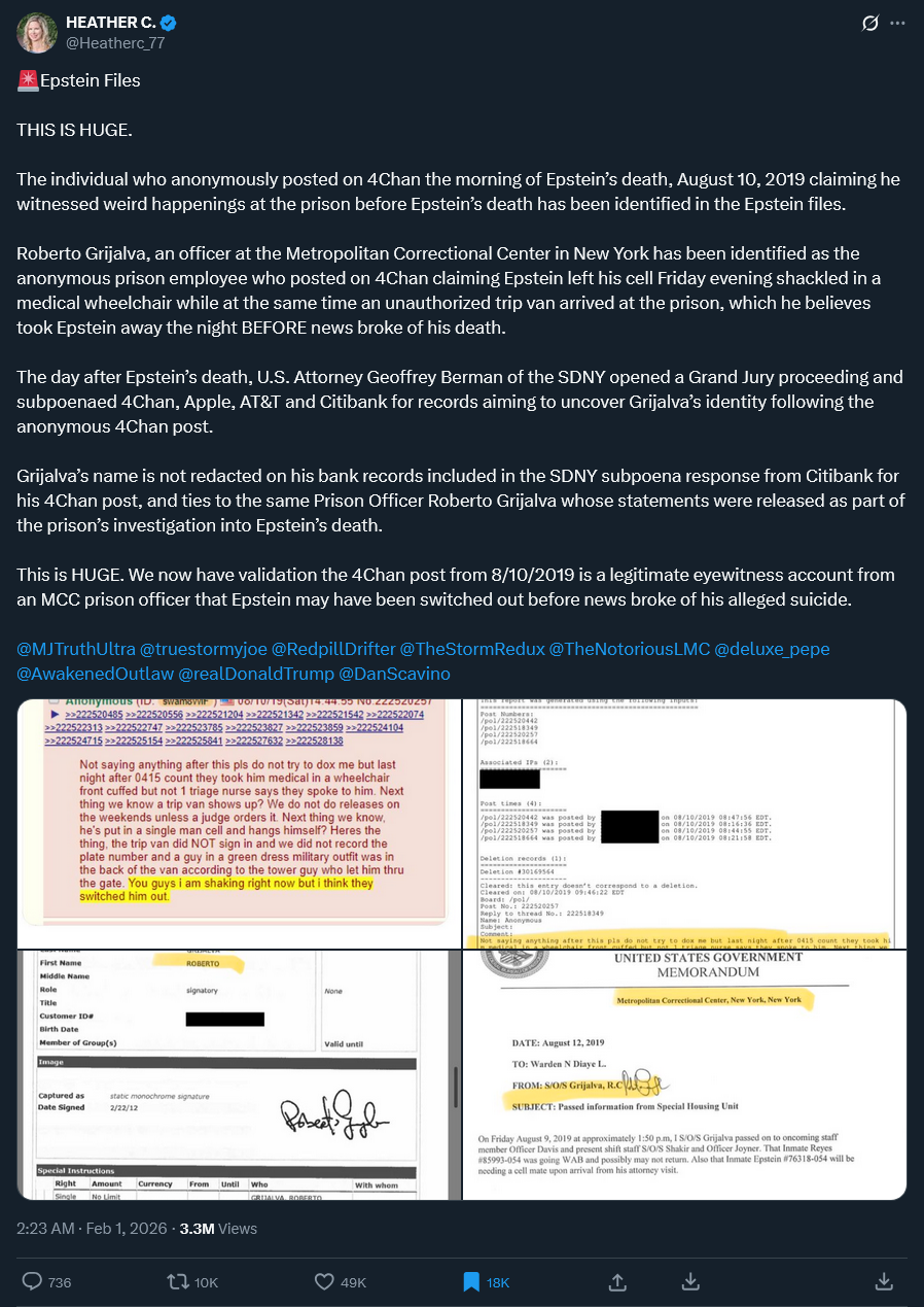 >>527796613>Government log forms, especially prisons, are seldom read if at all.Correct. With the times at the exact 15 min interval required by the watch level he was on I'd say much of this was pre-logged and he was only occasionally checked. Especially on night shift officers have a tendency to get very complacent/lazy. Earlier in the log it has an inmate watcher assigned to cell 4 and then after the shift change it notes epstein is assigned to that cell. I'd be looking for more about the inmate watcher and the shift commander that decided to go do an inmate escort below his paygrade lol