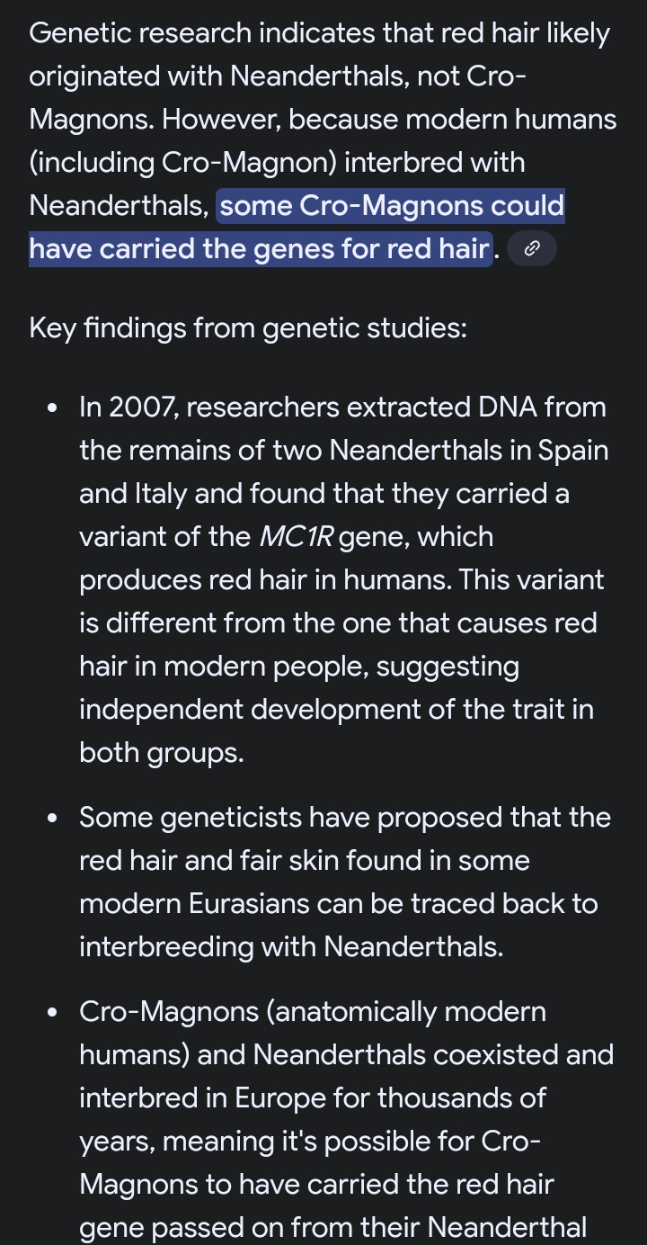 We actually gave the neanderthals their redhair genes originally not the neanderthals passing them down to cromagnon/progenitor Aryan btw.