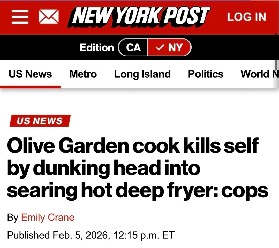 This is a story you'd read about on /b/ or fark way back in the day >An Olive Garden cook has died after he dunked his own head into a searing hot deep fryer — as his co-workers frantically tried to thwart his gruesome suicide, authorities said.>The employee, who hasn’t been identified, stripped his clothes off and thrust his face into the fryer at the chain’s restaurant in Williamsport, Pennsylvania, last Friday afternoon, the Smoking Gun reported.>“A male victim went head first into the fryers,” dispatchers could be heard saying in grim 911 audio.