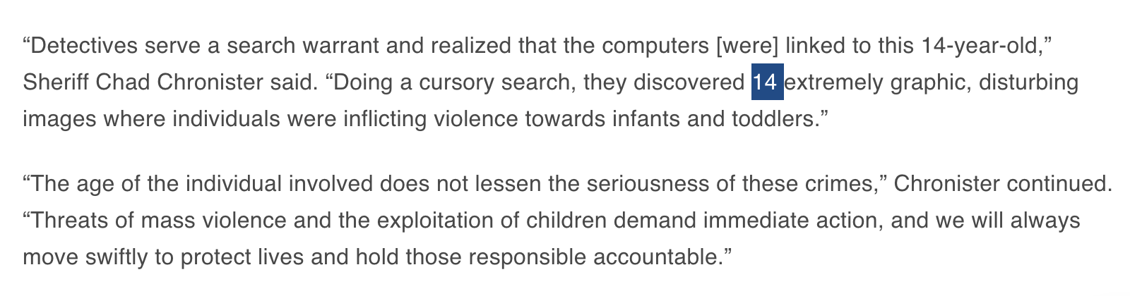 >>527913336>“Detectives serve a search warrant and realized that the computers [were] linked to this 14-year-old,” Sheriff Chad Chronister said. “Doing a cursory search, they discovered 14 extremely graphic, disturbing images where individuals were inflicting violence towards infants and toddlers.”