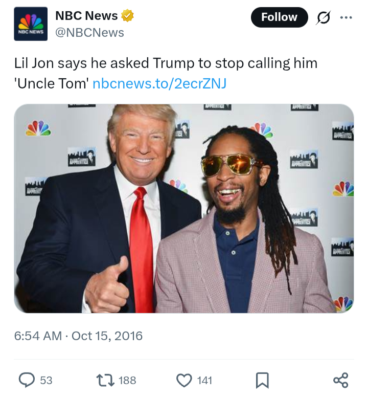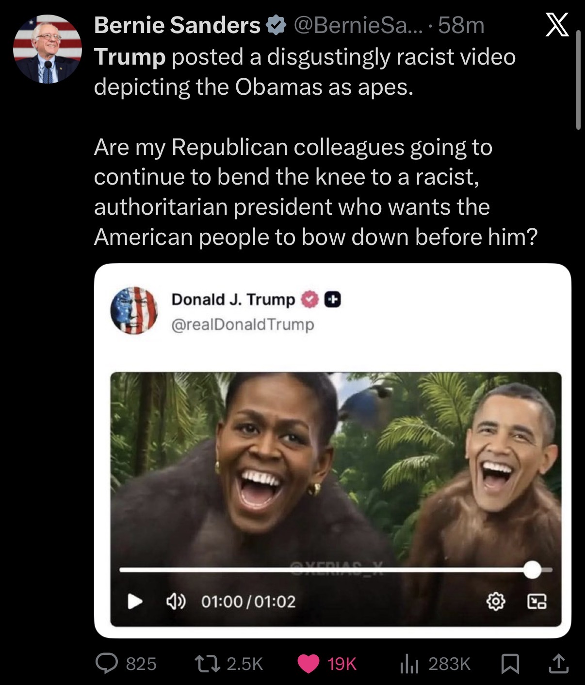 >>527918709It was obvious unintentional even in the original context. Then if you go find the full video it's an AI rip off of the lion king with all democrats being various animals. They then all kneel to Trump the lion, king of the jungle. It's not a racist video at all other than maybe the creator being cheeky by making the obamas apes.