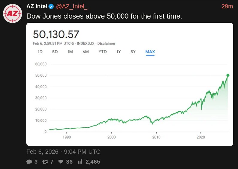 >Dow Jones closes above 50,000 for the first time.The winning continues.
