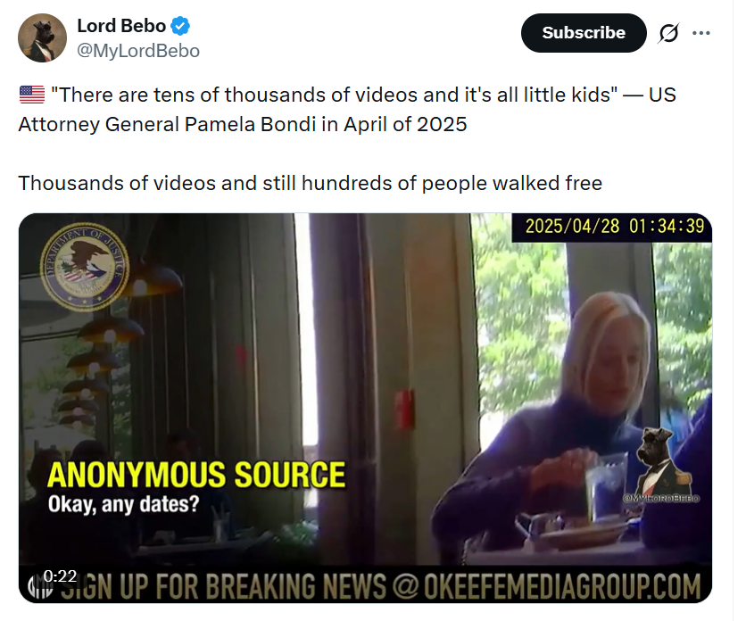 It'a nothing ? This shit is unfolding right now, you think this stuff gets solved or investigated over night ?Even Pam Bondi already declared the cntent of the more than 3.000 videos She said that those videos will never see the light of the day in public You know why? She confirmed all the videos are child porn watch from minute 2 to minute 3 her statement https://youtu.be/EgVISm9U8RI?t=136