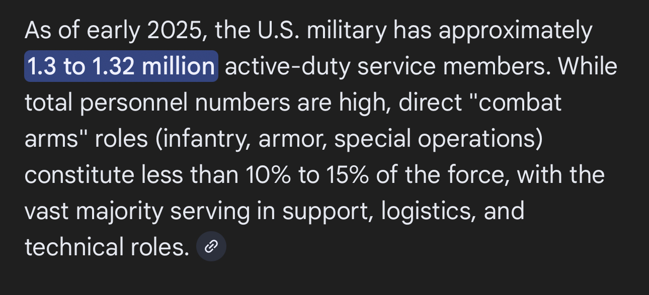 >>527931673>>527931738>also we're not talking about "cops" here what you're talking about would 100% draw in the national guard and other military branches>As of March 2025, the U.S. military had approximately 1.1 million active-duty personnel stationed domestically across 50 states, Washington, D.C., and five U.S. territories. and then start counting the FBI, ICE, et ceteraalso: the elephant in the room that is "secure communications in an environment where all tech is backdoored at the hardware level"