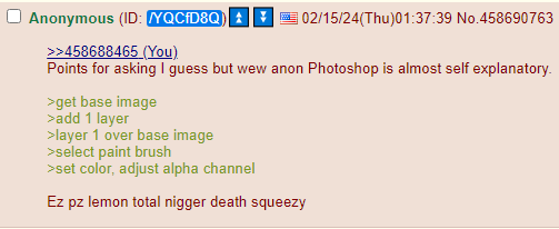 >>527941399In the manual days of using GIMP, you first had to autoselect the skin areas on each part of the body. Then you had to do layers on it. Then you had to carefully draw with your mouse, which sucks, Never touching the background, nor the lips, eyes, hair, etc. Doing each individual finger and not in between, etc. If you had 5-10ppl in the pic to do, it would take foreverAI now does it in 2 seconds flat. Making manual method obsolete, and we'll generate 100x more content this time around. I even take the pfp of kikes I'm about to reply to, grok it, and then post the blued kike in my reply to them. Doing it on the fly, means tons of anons are going to make fucktons even when not in the threadAll the stars have aligned in every single aspect, to make this the easiest, fastest, most content, most viral, most accepted by normies who began to notice or are on the verge of noticing, social media allows content like this without getting banned now, you name it. And much more...