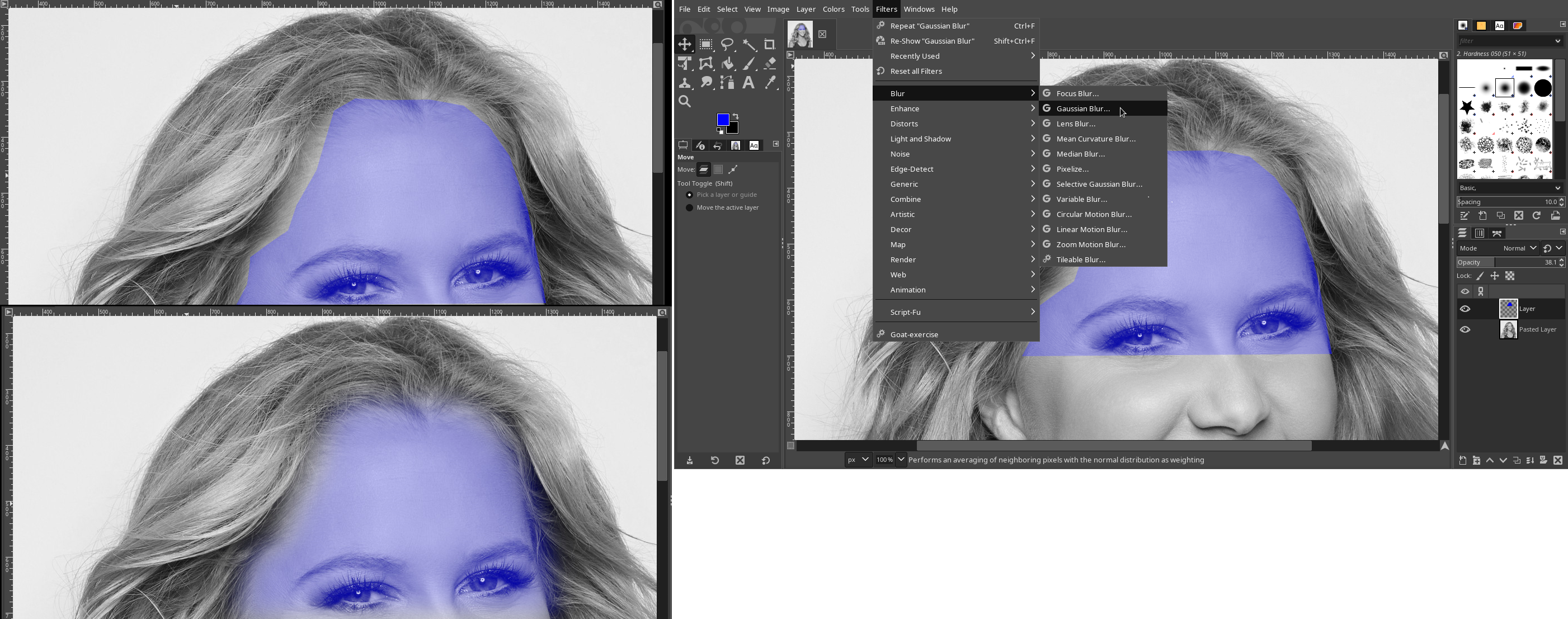 >>458805147 >Edges on this one were a little rough so I did a blur on the blue layer.Filter menu (top) > Blur > Gaussainthen pick desired strength with the 'size' slider
