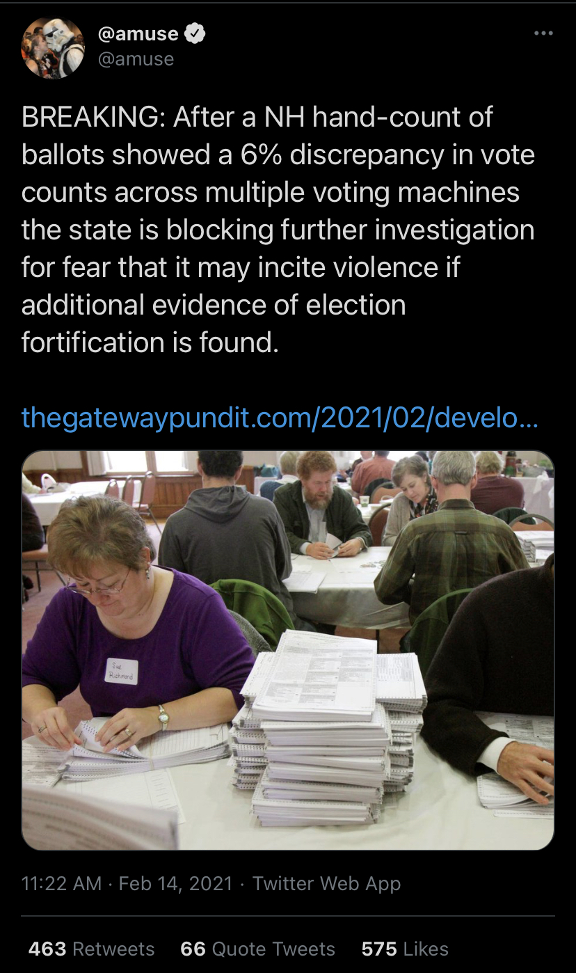Using covid as an excuse for mail-in voting was a dirty trick, but other than that it wasn't rigged.Compare some of the more intelligent posts in this thread (sometimes people that are wrong still manage to cobble together a decent argument) to the retarded shit Trump has recently posted on social media. He seems to believe that foreign governments used technology to flip votes in the voting machines from Trump to Biden. He's fucking delusional.
