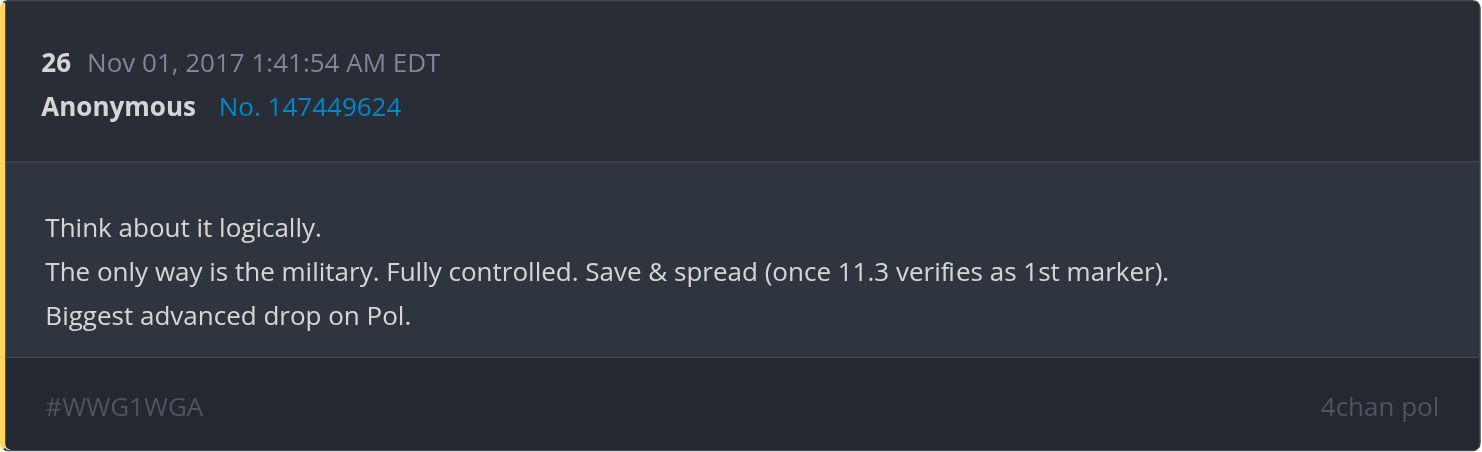 >>527970447>Q-anon plagiarized and claimed credit for facts uncovered by /pol/ anons, and repackaged them for James Bond wannabe boomers to slurp up like goyslop.Yes, that's literally how an intelligence operation works:First, /ourguys/ pretended to "just be another anon on 4chan", which disseminated the information for the rest of us to grow interest in and proliferate. Once a threshold of competence and interest was achieved and properly concentrated, they gave us a signal to organize and that signal was the first posts from /CBTS/.During the inital posts, Q made it very clear they were evident Military Intelligence Operatives. They did this through adequate signaling that, if you were around roughly a decade ago, you would have noticed. After enough of us gathered, they began seeding information among themselves and also to us in an effort to further spread the information.See, the drops were not "predictions" like the media, other operatives and normalfags have been trying to confuse each other about. The Q operation was a Signals Intelligence operation designed to function directly with decentralized and undercover operatives. The operating party in question was comprised of certain, apparently friendly forces within the Military Intelligence world. After having groomed anons for a long time to help them out, they set us free live with an intelligence operation mostly aimed at other operatives. The beauty of a SIGNINT op like this is it speaks to multiple parties at once and, as such, didn't function as "predictions" but as phase triggers, dissemination routines and confirmation processes that helped align civies involved.