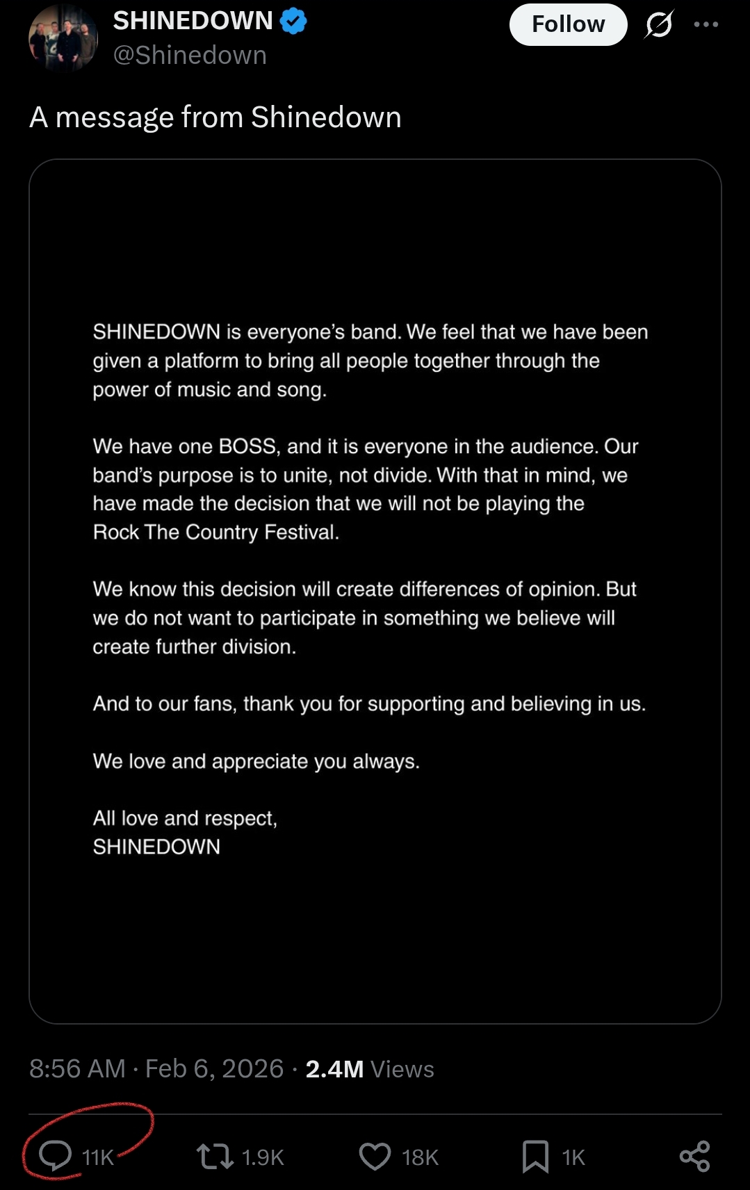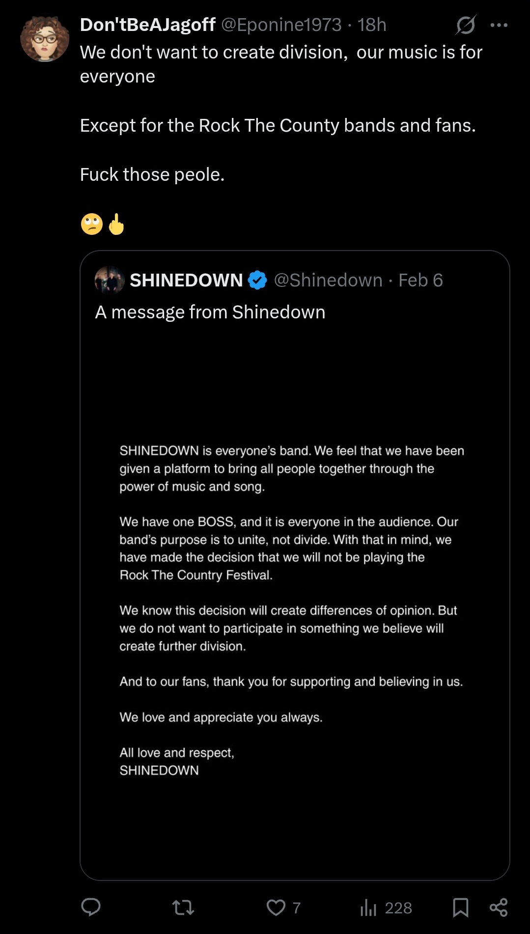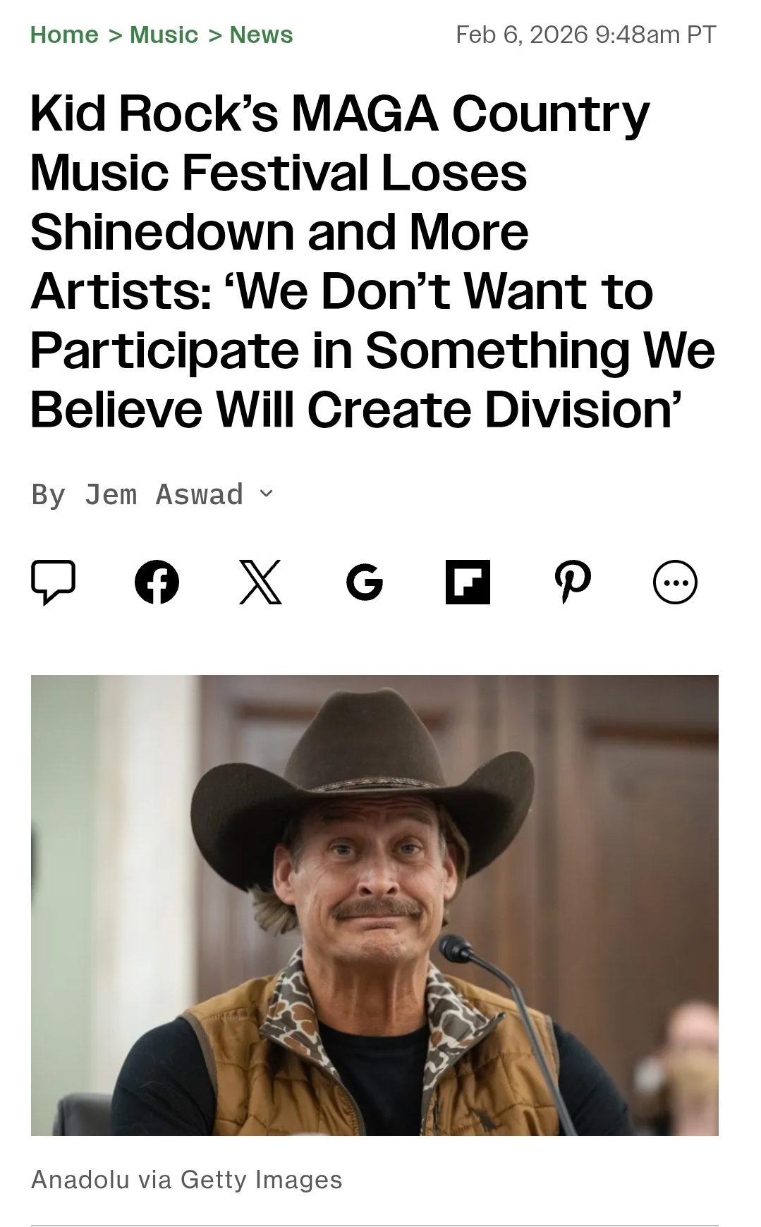 Turns out playing a MAGA music festival is pretty divisive.Now they're fucked either way because Maggots will boycott them.Kid Rock: not even once.