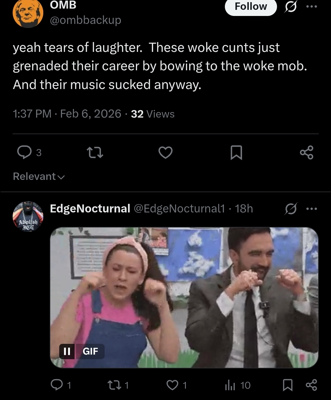 >you shouldn’t be canceled for your political beliefs! Elon needs to buy twitter!>what? You won’t play our shitty maga fest!? Fuck yoi! Say goodbye to your career fucko!MIGA is a cult