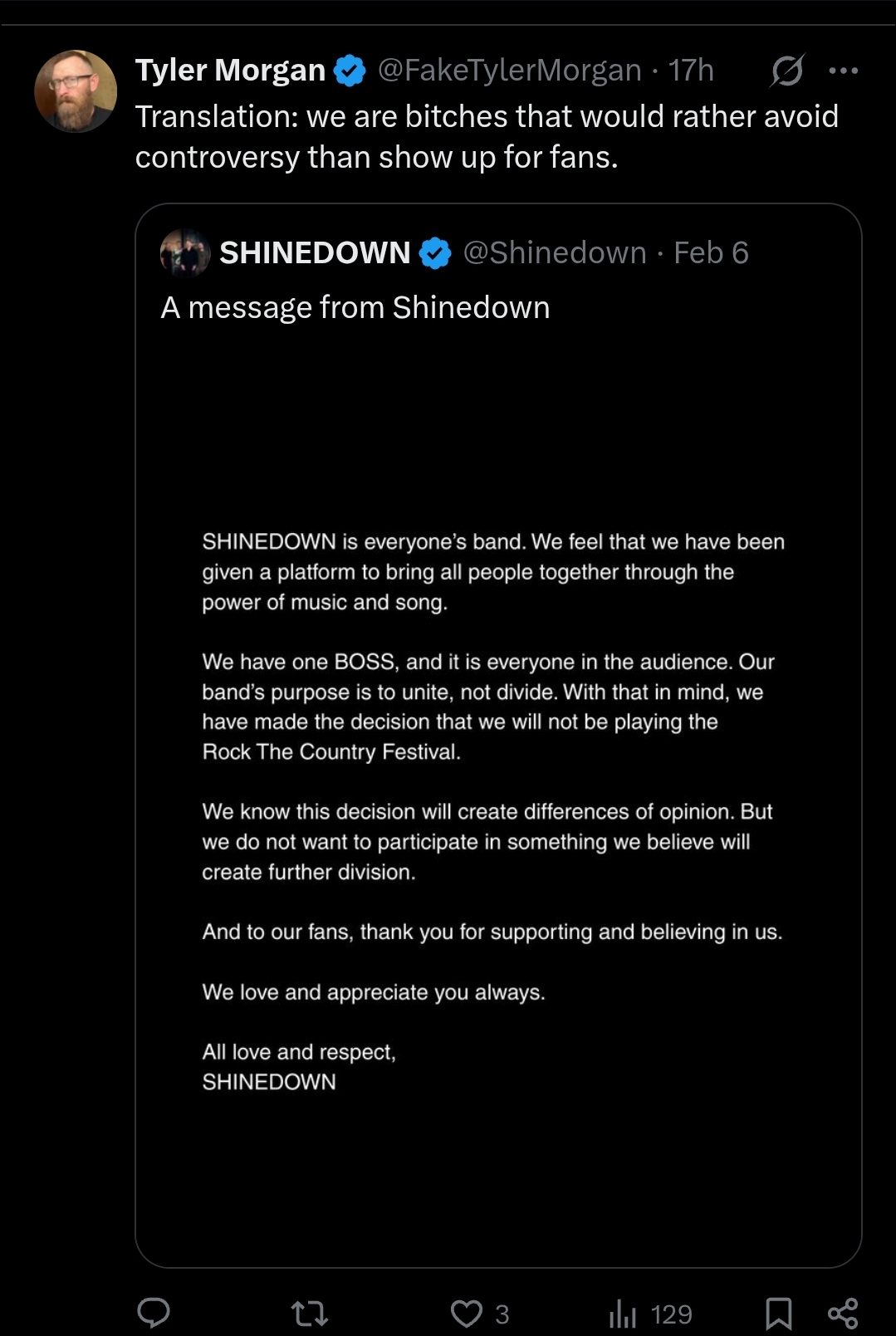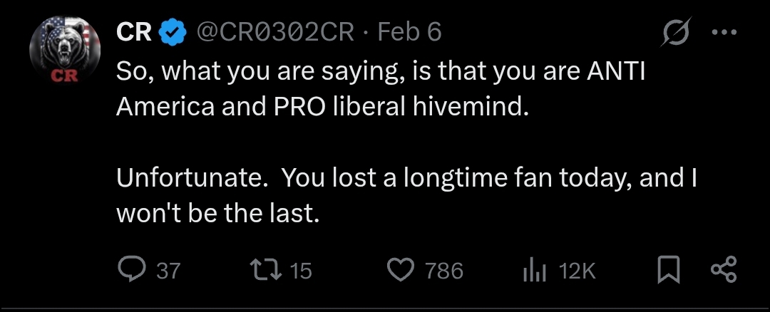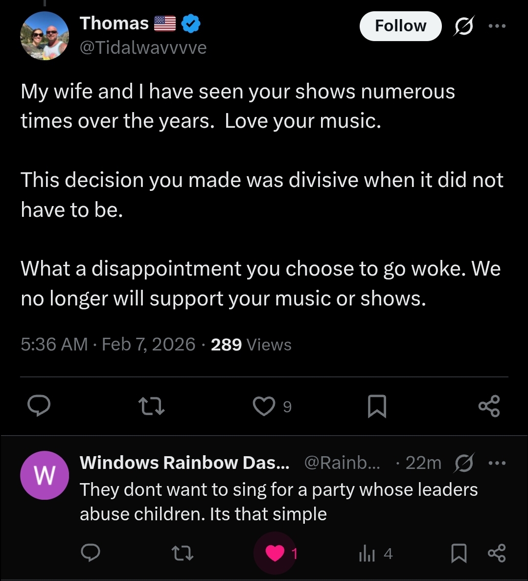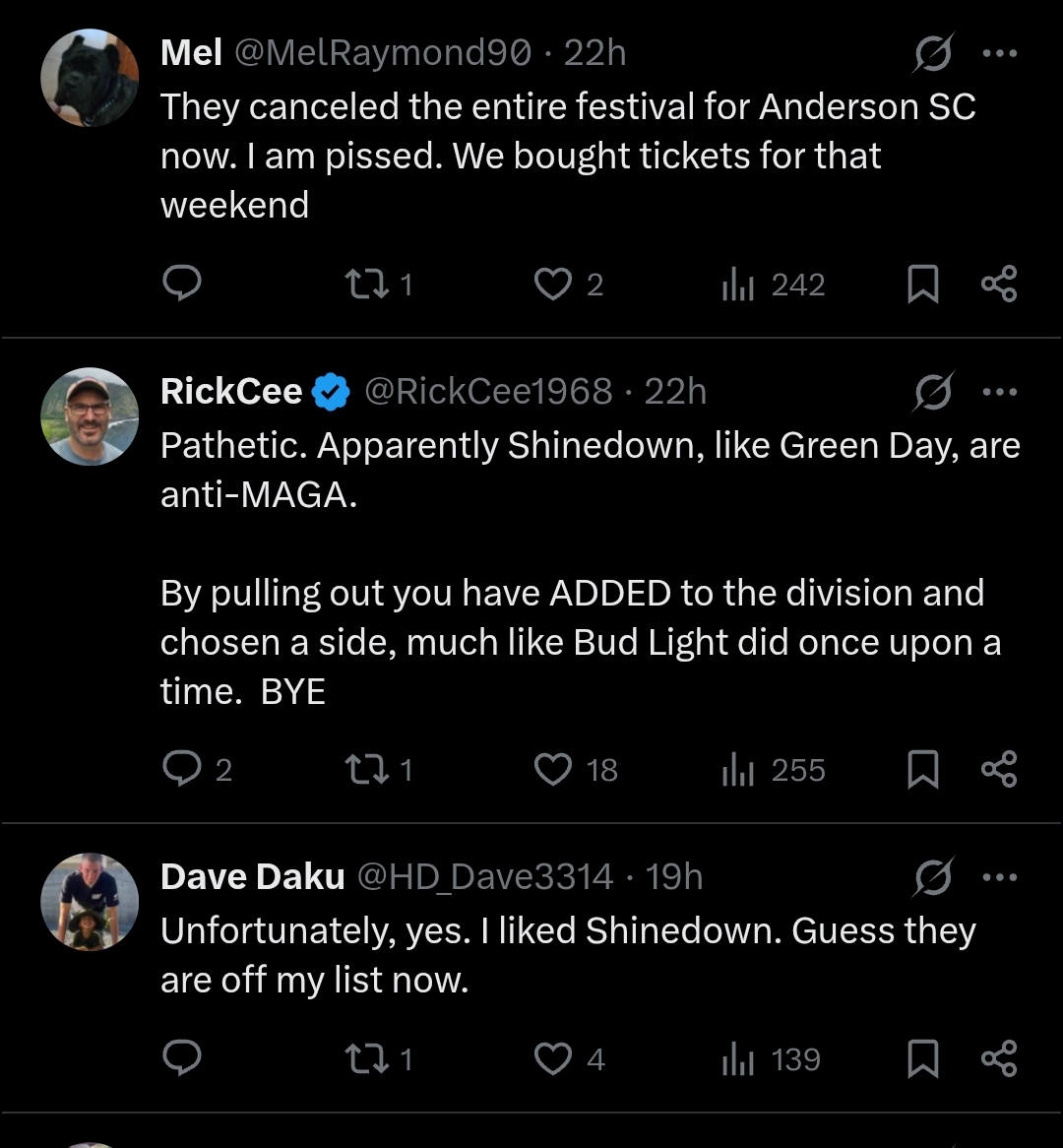 >>527971653Perfect time to collect tears, btw. They are BIG MAD.I don't know how a group of people that is "winning so hard," has given the world more cope and seethe than MAGA, in the last year......but, here we are.https://x.com/Shinedown/status/2019772265978585350?s=20https://variety.com/2026/music/news/kid-rock-maga-country-music-festival-loses-shinedown-1236654617/