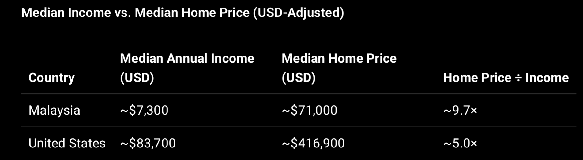 >>527974075Those prices only sound reasonable because you earn a higher wage. For the people in Malaysia that's almost twice as unaffordable as homes in America.