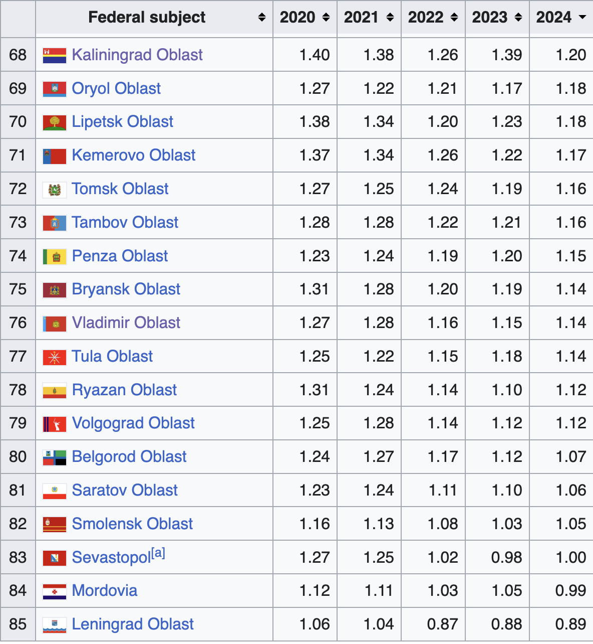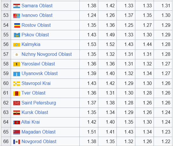 >>527979502Nah, even 99% Russian regions still have higher fertility than Poland. You are discovering just now that the more you grow economically, the more you nuke your birth ratehttps://en.wikipedia.org/wiki/List_of_federal_subjects_of_Russia_by_total_fertility_rate