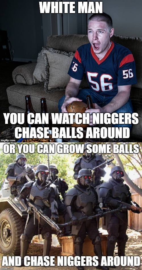 >>527980059 I like many others used to consider watching niggerball a masculine activity. jews spam it on the networks and pay people to talk about it 10 months out of the year.Then I found out about real macho, masculine activity - Being racist towards kikes and nonwhites.