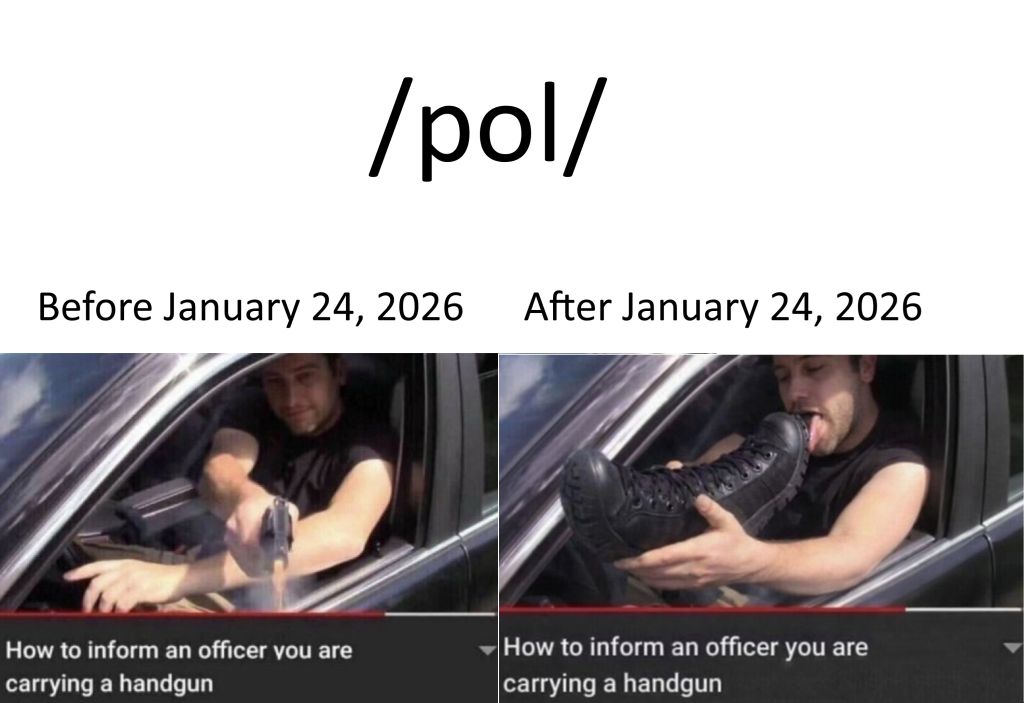 >>527983774Meme unironically true, if you have a handgun and interact with the govt who is also heavily armed. You best be respectful. The thing about guns is, as long as everybody acts respectful nothings going to happen. Plenty of examples on YouTube of this going as it should. But Pretti was delusional, and disrespectful, got into a street fight with authorities, and was capped for his insolence. Whether he was fighting with cops, or kicking some guys maga truck, or whatever, he was definitely asked for it, wasnt prepared to actually use the weapon he wanted to threaten everybody with, and got as he deserved. Leftists like Pretti are delusional, and unserious even if they act tough in a group. He was simping for Somalis, and wanted to be gangster, and when it came time to do gangster shit he got killed like a bitch.Your boy died like a bitch, face in the mud, executed rightfully by the pig. L O L.