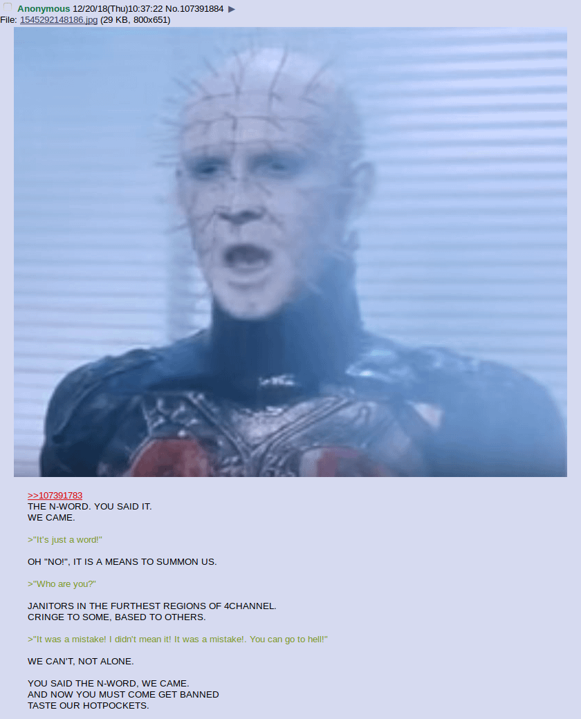 >>527980570But for them pleasure is pain. Sensation itself is to be explored in every avenue.Extreme pain to them is itself orgasmic, and religiously they are committed to it. I'm not sure this redditor has the emotional bandwith to weigh in on the subject at hand with such poor literary interpretation as to reduce the Cenobites to Avengers of political adgenda.Cenobites are mostly unconcerned with political motivation unless it can be wound into their rituals of wounding and psychological tourture. To inflict only pain on a creature for its existence as an arm of authoritarian government state policy feels completely reductive of clive barker's work.