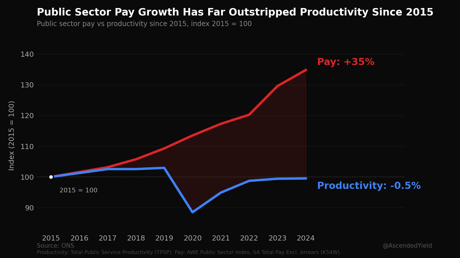 >New ONS public sector productivity statistics have been released. In 2024, there was 0.0% productivity growth in the public sector. In return, civil servants were offered up to 6% additional pay. Make it make sense.>Pair ONS public service productivity with their pay index (AWE) and it gets even worse. Since 2015, public sector pay is up 35%, productivity is down 0.5% Really need to get myself a civil service job, sounds like an absolute doss