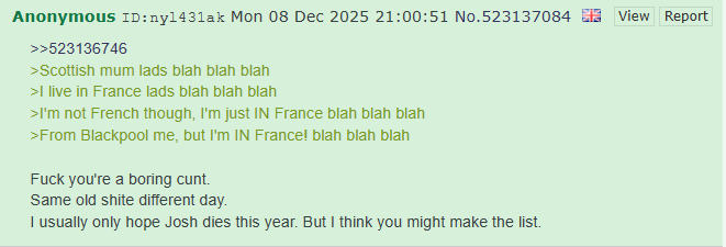 >>527991144French flag anon doesn't make it any easier, he reckons he's from england but the flag is very offputting and distracting