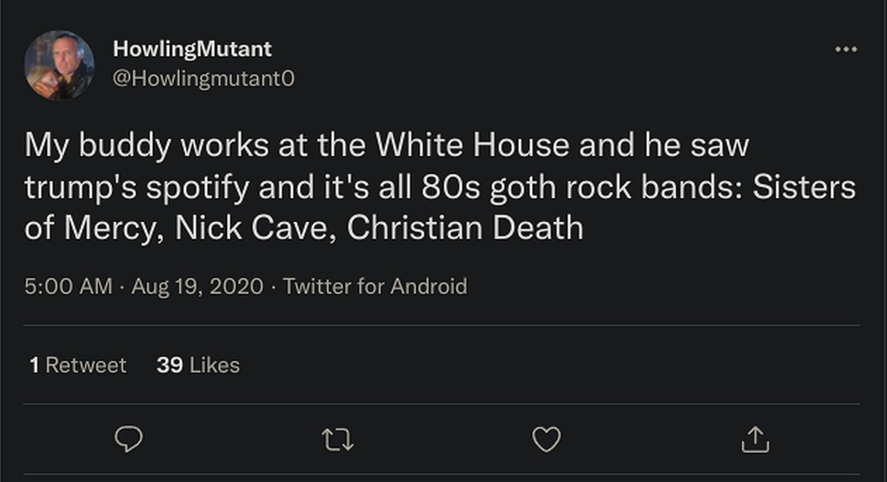 >>527987474>50 year olds who dress like teenagers shout orange man bad againI'd like to hear some really rebellious music talking about Jewish control, black crime stats and visajeets.
