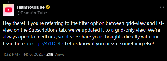 >updated>remove feature entirelyanyone getting forced zoomer mode on youtube?cant get my sub list without it looking like Windows 8 or netflix or whatever its emulatinghttps://chromewebstore.google.com/detail/youtube-list-view-mode/gefbgfmdacpikggkopbjdjlpfcmgmkophttps://addons.mozilla.org/en-US/firefox/addon/youtubelistview/extensions fixed it up